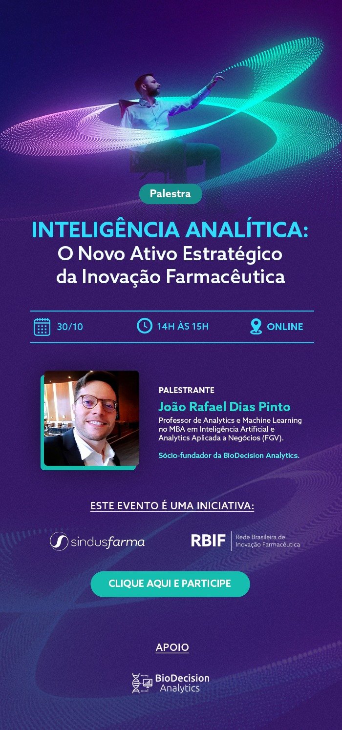 Por que discutir inteligência analítica em plena era da inteligência artificial? Com o propósito de provocar uma reflexão sobre o papel da inteligência analítica como geradora de valor estratégico para o setor farmacêutico, João Dias, cofundador da BioDecision™, apresentou uma palestra no evento promovido pela Rede Brasileira de Inovação Farmacêutica (RBIF), da Sindusfarma. Durante o encontro — realizado em formato online — foram discutidos temas que abrangeram todo o ciclo do dado ao conhecimento, além de um panorama econômico sobre o uso da IA na indústria farmacêutica. Por meio da apresentação de três casos de uso reais, João demonstrou como a combinação entre técnicas analíticas adequadas, perguntas bem formuladas e um delineamento inteligente de estudo pode ser decisiva para maximizar o valor extraído dos dados de P&D (bio)farmacêutica, impulsionando inovação e eficiência em todo o processo de desenvolvimento científico.